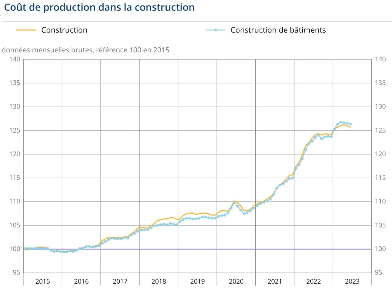 Construire coûte en effet de plus en plus cher : matériaux, main-d’œuvre, énergie. D'abord causé par la crise sanitaire Covid puis par la guerre en Ukraine, la production de matériaux s'est ralenti, parfois stoppé avec la flambée des prix de l'énergie en 2023.