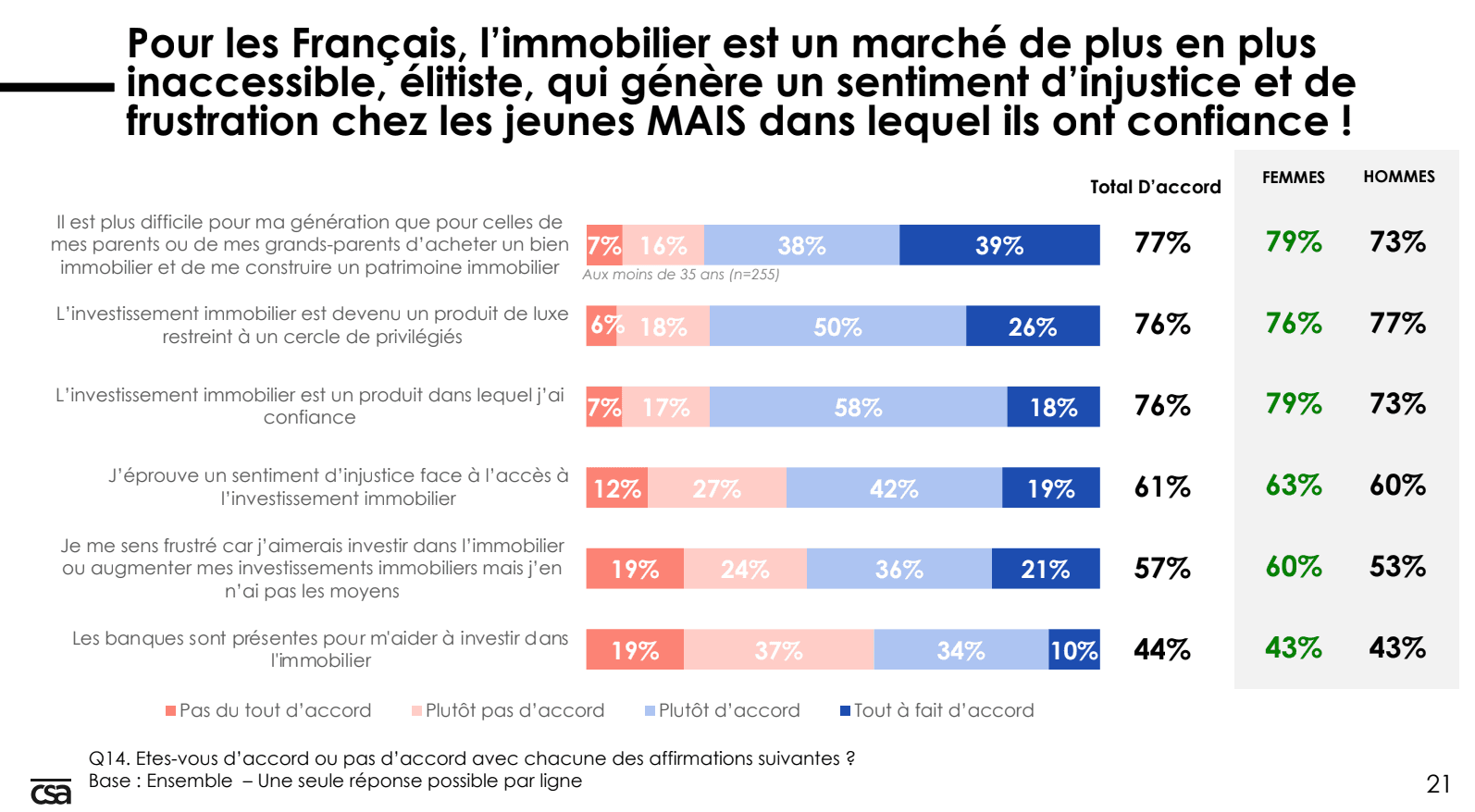 Sans surprise, ce sont donc 76% des Français qui pensent aussi que l’investissement immobilier est dorénavant un produit de luxe, restreint à des privilégiés. Et 61% qui estiment même ressentir un sentiment d’injustice (72% chez les moins de 35 ans)